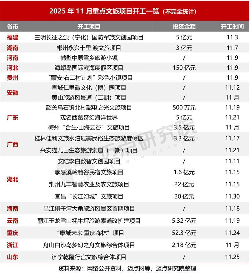 据迈点商量院不彻底统计,2025年11月宇宙开工要点文旅相貌共21个,分散于福建、湖南等14个省,其中以湖北、广东相对密集。本月,开工文旅相貌投资金额超亿元的共12个,“康城改日·重庆丛林”、海螺岛国际滨海度假区这两大相貌投资额更是高达50亿元以上。前者总投资52.3亿元,以东谈主工智能+新医养”为特色探索文旅康养交融发展新旅途;后者总投资150亿元,打造集体育、度假、主题乐土、买卖、会展及旅游文化于一体的朔方滨海城市离岸度假胜地。