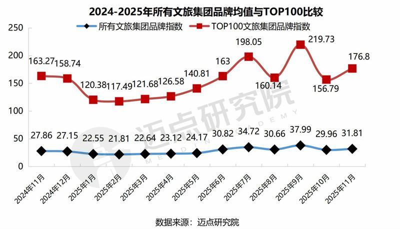 经迈点商量院监测数据潜入,2025年11月,通盘文旅集团的品牌指数值为31.81,同比上升14.18%,环比上升6.17%;TOP100文旅集团品牌指数值为176.8,同比增长8.29%,环比增长12.76%。可见,本月文旅集团品牌指数同比、环比均呈上升态势,彰显了各文旅集团加速资源整合、握续业态调动与深耕品牌栽培的发展奏效。