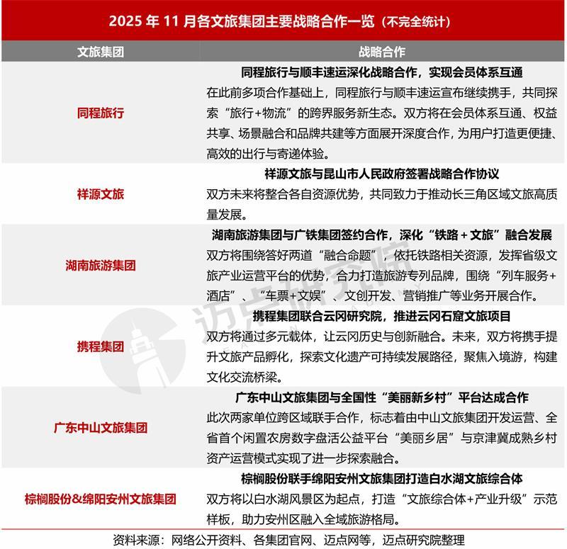据不彻底统计,2025年11月,共有6起文旅集团战术互助要紧事件值得热心,涵盖“旅行+物流”、“铁路+文旅”、乡村金钱周转与运营、要点文旅相貌设立、县域文旅系统互助、文化遗产旅游标杆打造等,利于施展各方上风、周转不同鸿沟的存量资源、调动与优化文旅供给等。