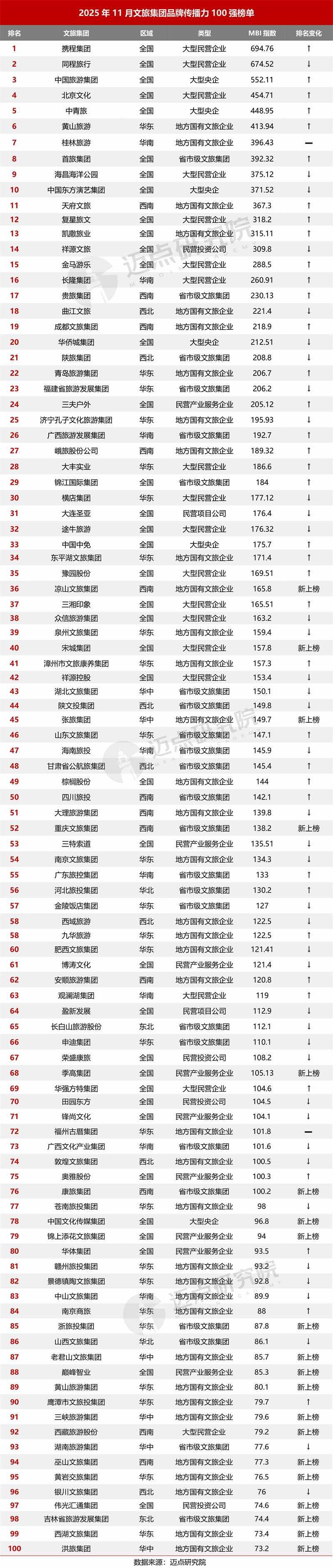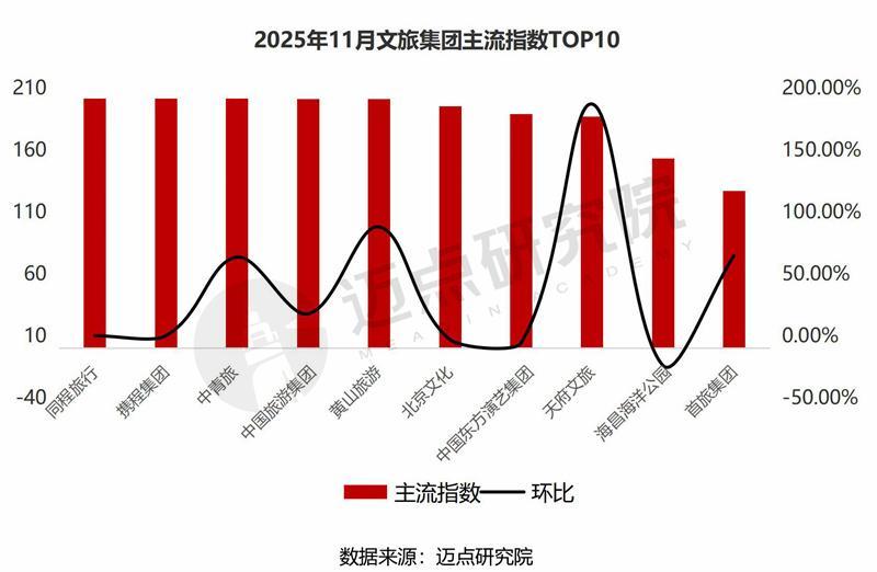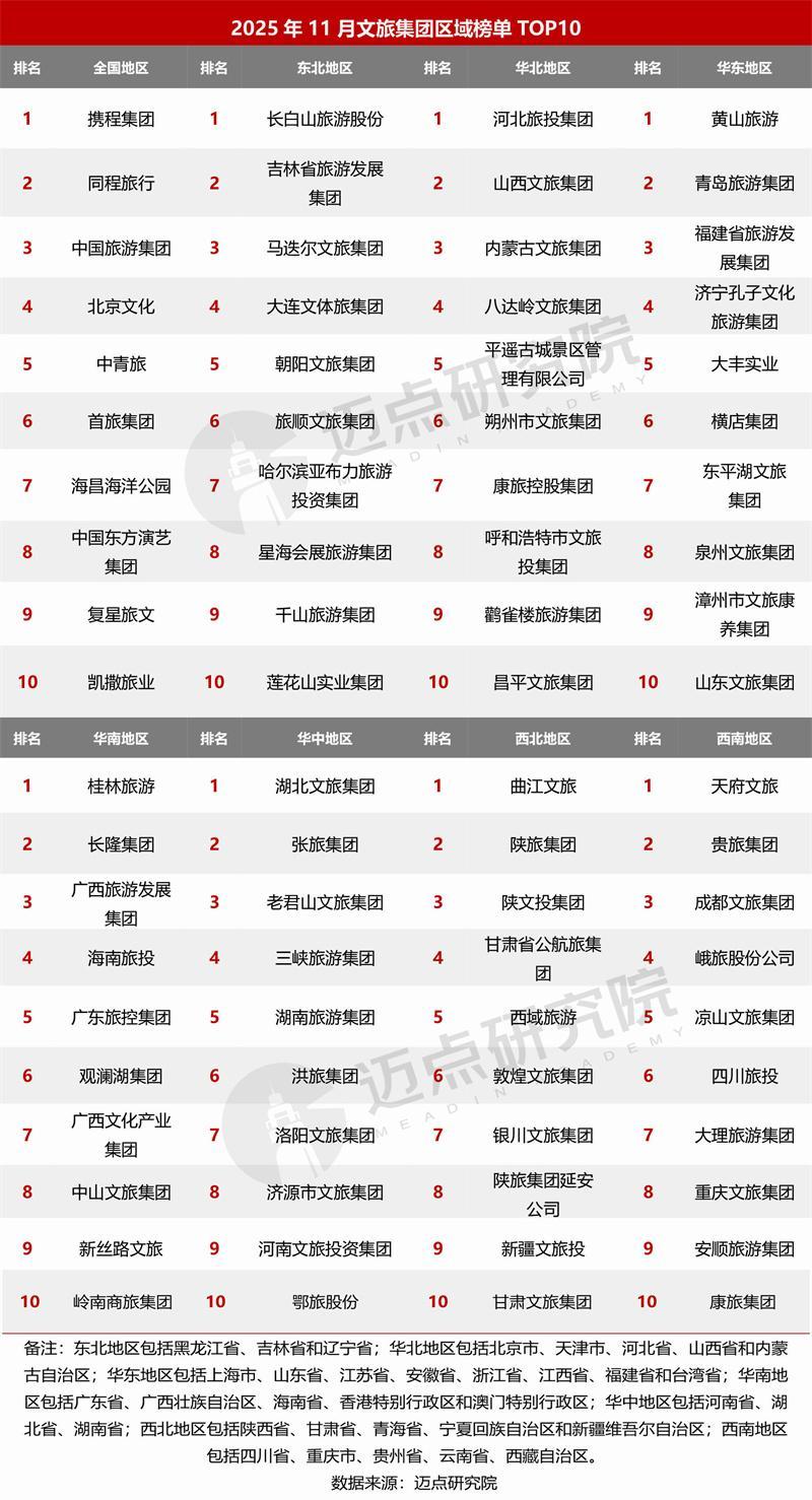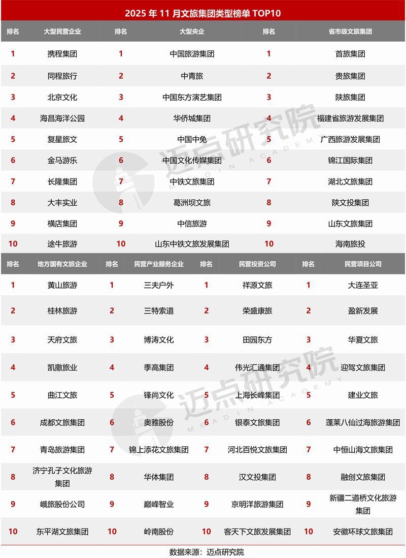 据迈点商量院数据潜入:11月,携程集团、同程旅行、中国旅游集团、北京文化、中青旅、黄山旅游、桂林旅游、首旅集团、海昌海洋公园、中国东方演艺集团位列榜单前十。其中,百强榜单中共有38家文旅集团排行环比上升,40家文旅集团排行环比着落,20家文旅集团为新上榜,2家文旅集团排行保握不变。