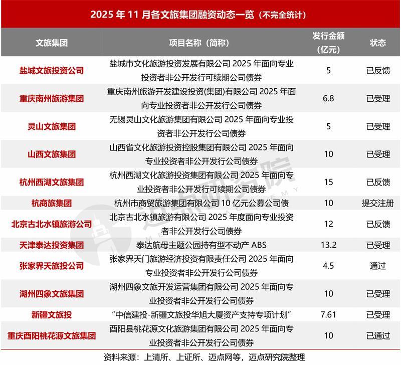 11月,以盐城文旅投资公司、重庆南州旅游集团、灵山文旅集团等十余家文旅集团为代表,各文旅集团发债频频、融资进展加速,波及金额约109亿元。从融资品种分析,泰达航母主题公园握有型不动产ABS、“中信建投-新疆文旅投华旭大厦金钱扶持专项磋磨”这两大ABS相貌值得格外热心,前者为国内首单文旅类握有型不动产ABS(入池金钱为4A级景区“基辅号”航母主题公园)、后者基础金钱为华旭大厦房钱收益。上述文旅ABS相貌反应了文旅集团通过金钱证券化周转金钱、拓宽融资渠谈的调动探索,亦彰显了本钱市集对优质文旅存量金钱的价值招供。