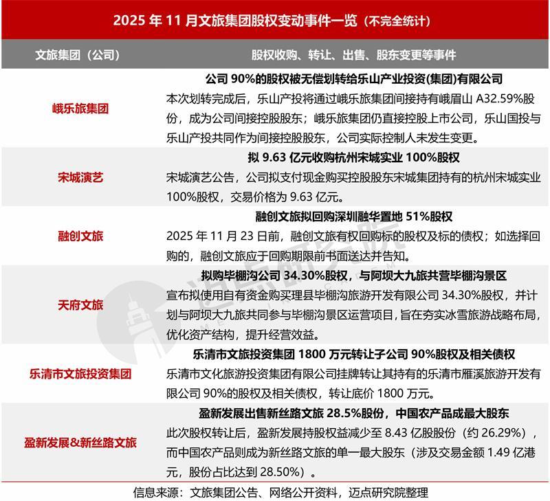 11月文旅集团动态回来:东谈主事层面,锦江国际和华裔城两大头部集团均有高层换届与东谈主事变动——张晓强任锦江国际集团党委通知、董事长,吴秉琪出任华裔城集团有限公司党委通知、董事长;宋城演艺拟以9.63亿元收购杭州宋城实业100%股权,该来往完成后,集团将利用标的公司地皮使用权和房屋扩大宋城景区策动范围,酿成一个全新的“宋城景区”。