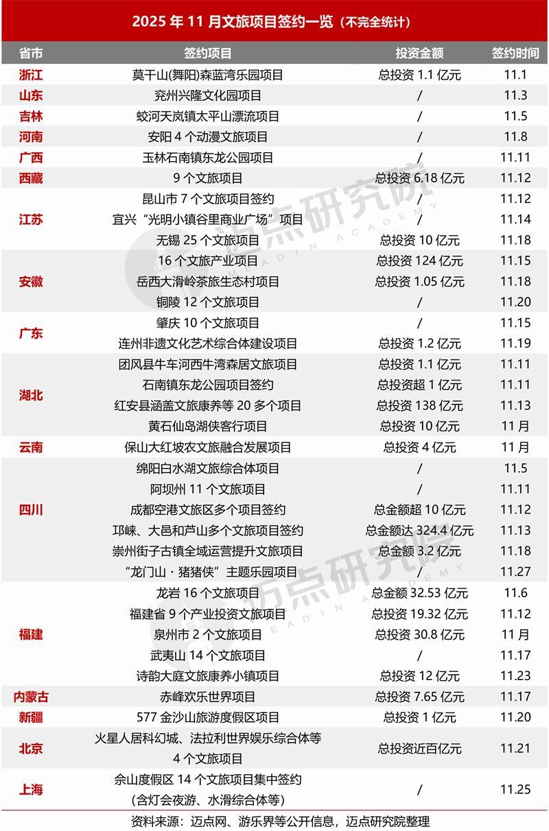 据迈点商量院不彻底统计,2025年11月共签约文旅相貌超200个,签约总金额超925亿元。本月,宇宙各地加速文旅招商投资力度,冲刺年度投资地点,以四川、湖北、福建、安徽、江苏、上海、北京等为代表16个省(直辖市、自治区)均有文旅相貌签约,且蚁集签约表象较为多数。