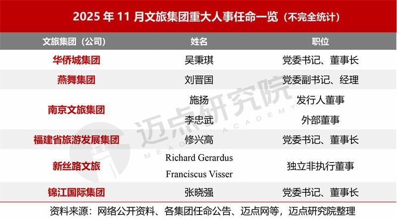 据不彻底统计,2025年11月,波及6个文旅集团的东谈主事任命与高层变动。其中,吴秉琪任华裔城集团党委通知、董事长,张晓强讲求任命为锦江国际集团党委通知并提名为董事长,