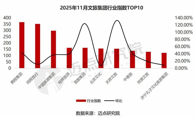 11月合座文旅集团品牌行业指数均值为7.37,环比增长约17%;TOP100文旅集团品牌行业指数均值为55.01,环比增长约25,即本月文旅集团的“行业声量”增强。本月,文旅集团行业热心度前十为携程集团、同程旅行、中国旅游集团、桂林旅游、首旅集团、北京文化、天府文旅、中青旅、祥源文旅、济宁孔子文化旅游集团。其中,首旅集团、天府文旅本月行业指数环比增幅相对明白,具体为124.05%、132.77%。以首旅集团为例,刊行债券动态与进展、“十五五”时间集团将加强产业执行化与执行产业化设立等战术部署激勉迈点网、经济参考网等行业媒体热心。